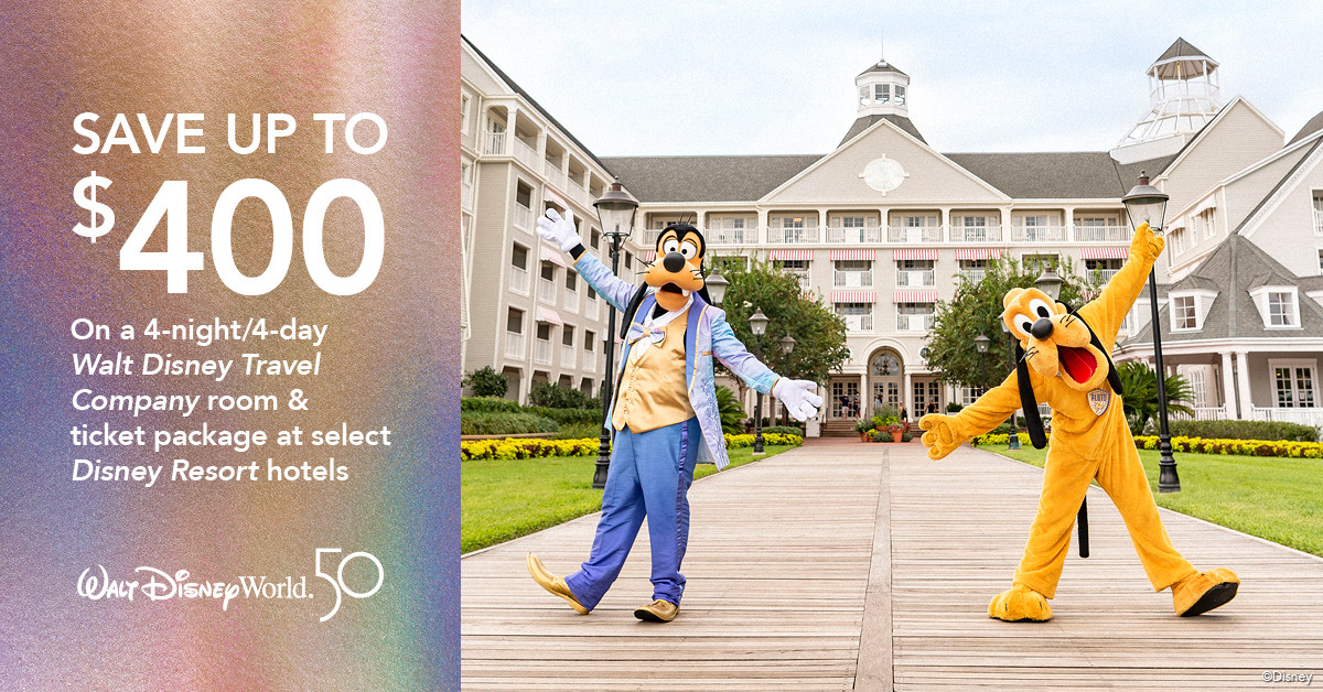 Stay in the magic with this special offer—and join in the fun before the Walt Disney World 50th Anniversary celebration ends! Save up to $400 on a 4-night, 4-day Walt Disney Travel Company room-and-ticket package at select Disney Resort hotels, valid for stays: